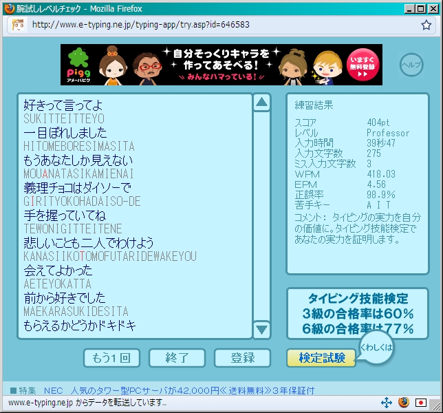 数日前、久々にe-typingで好成績を出せました~。久々に400点越え!とはいってもいつもこんな記録出せるわけじゃないんですけどね・・・。