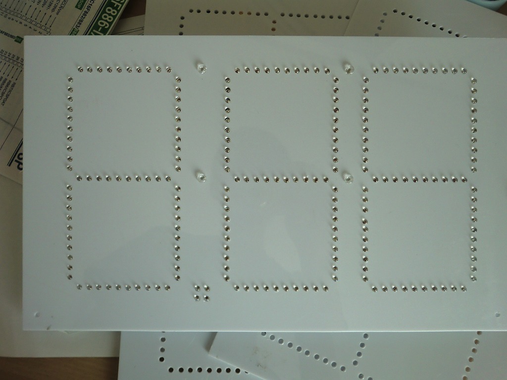 の500個入1000円のLEDを使用。1タイマーに214個のLEDを使用し、3個で合計214×3=642個のLEDを使いました。この量のはんだ付けはさすがに疲れた・・・。
