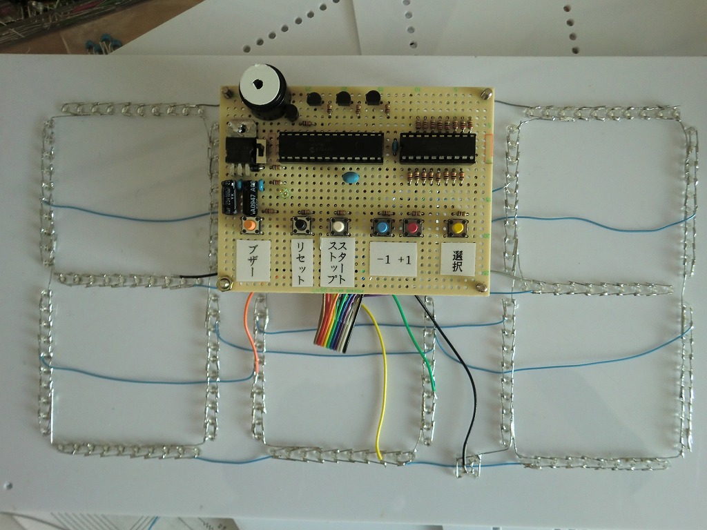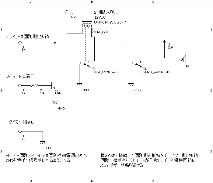 実際にイライラ棒に取り付ける時は、イライラ棒回路に棒が当たるとずっとブザーが鳴り続けるという回路を追加しました。