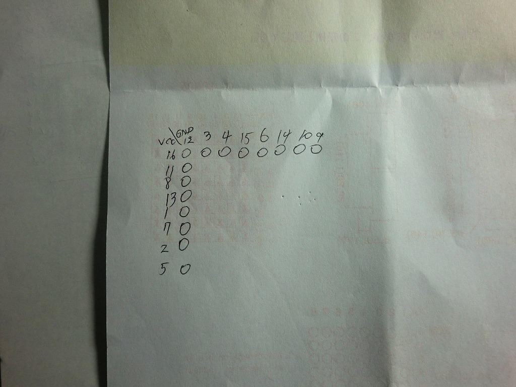 他には、付属で付いてきた資料とピン配置が違ったこと。最初、資料の通りに配線するとちゃんと全部点灯せず・・・。自力で端子を調べてみると下の写真のような感じに。