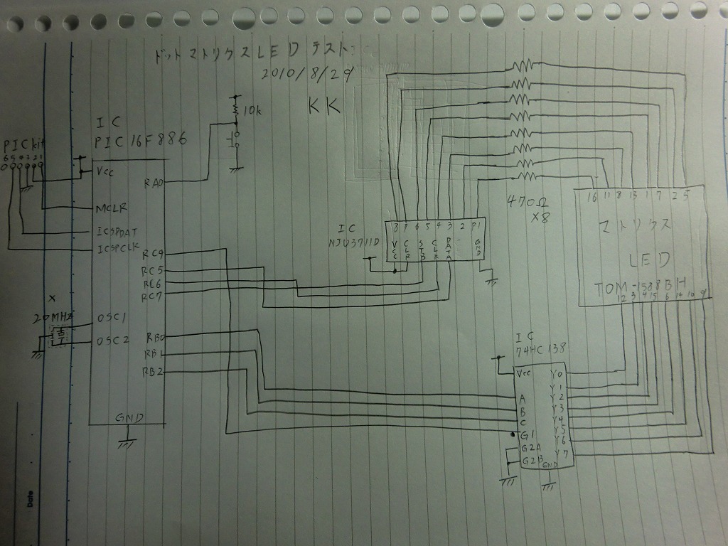 ちなみに、回路図です。制作後にぱぱっと書いたものなので、汚いうえに間違ってるかも。参考程度にどうぞ。