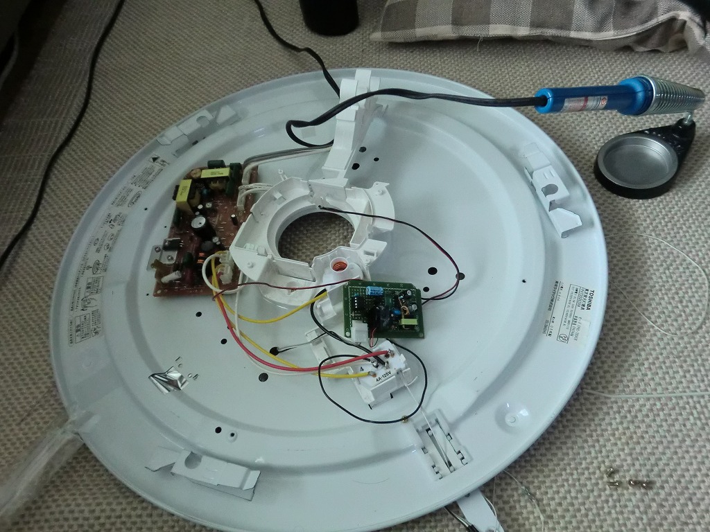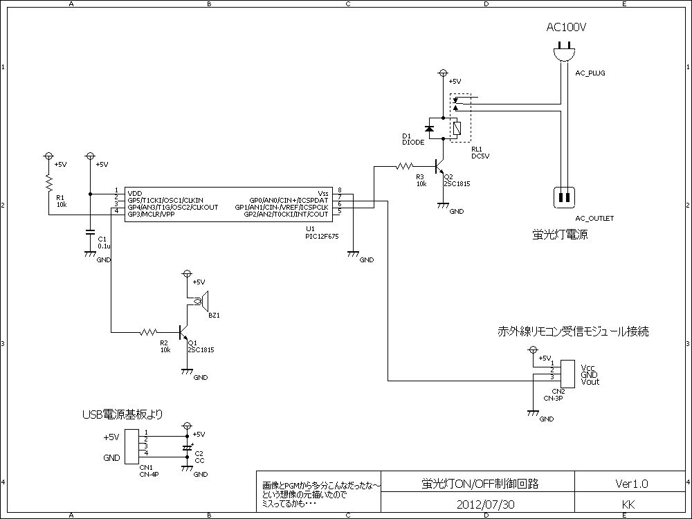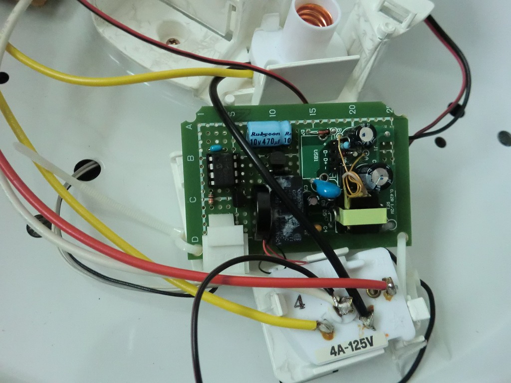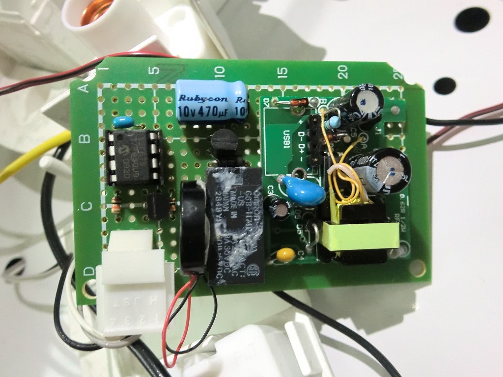 回路の電源は100Vを5Vに変換して使用。前に店で買った100VからUSB電源を取るアダプタがあったので中の回路を利用しました。