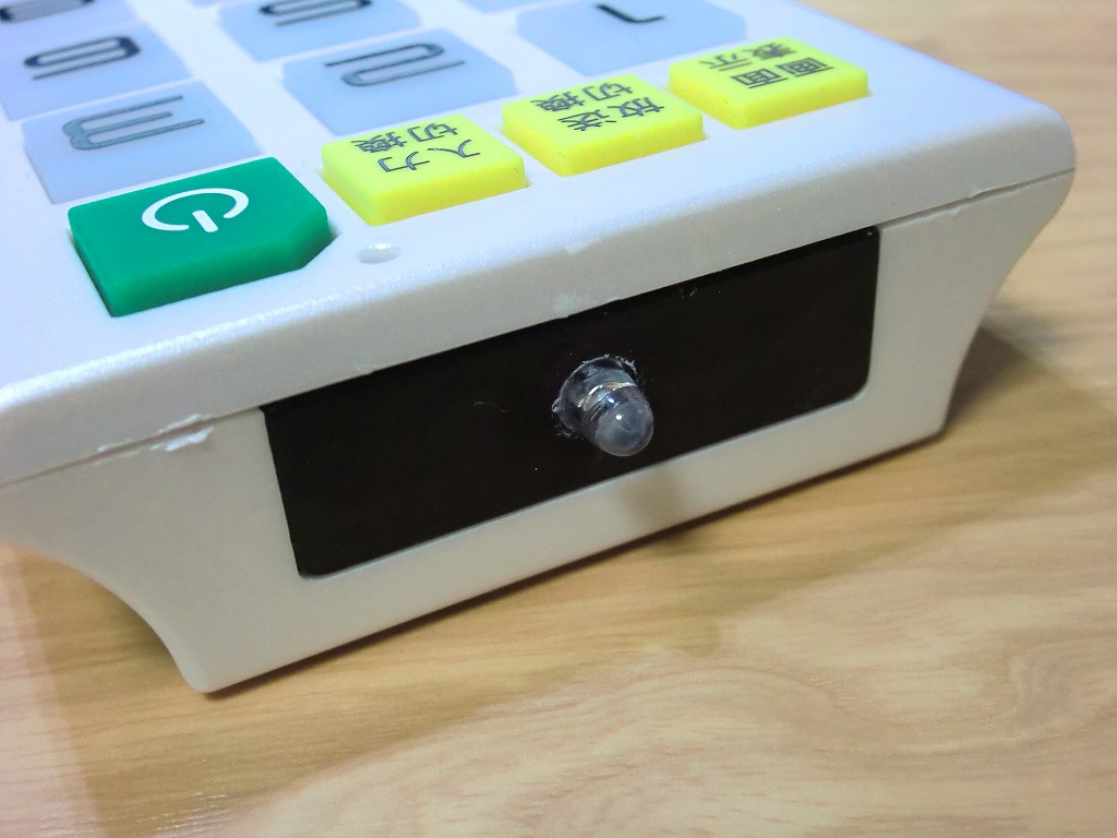 完成後使ってみるとちゃんと受信機に向けないとうまく送信してくれなかったので、ドリルで穴を開けて赤外線LEDを外に出しました(右写真)。それによって送信できる範囲が広がりました。