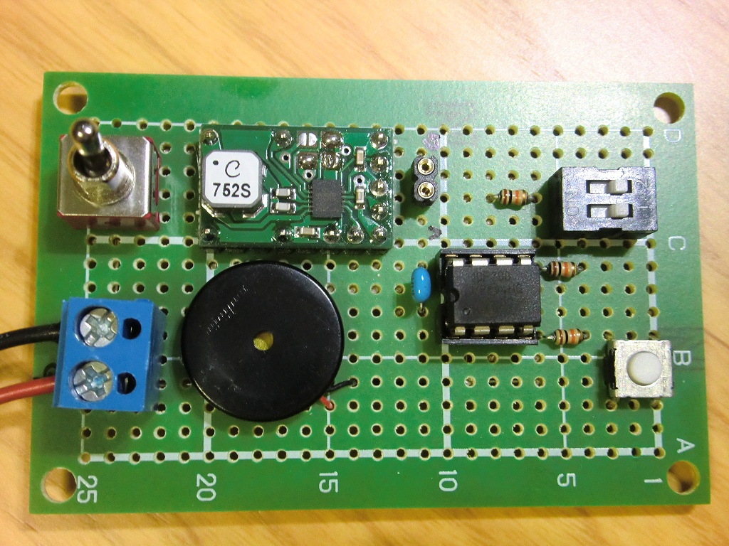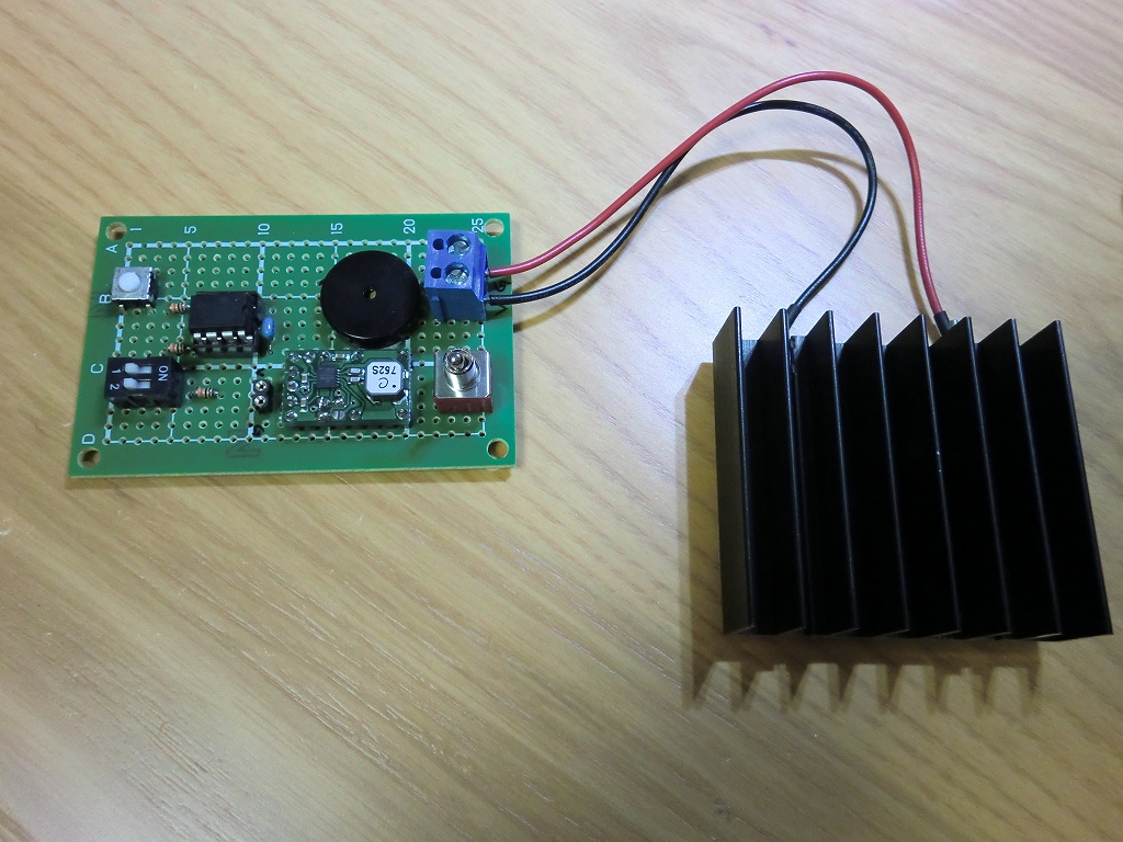 DC-DCコンバータの出力は3.3Vで利用しています。更に低い2.35Vでも10F200は駆動しますが、ブザーの音が小さくなるのでこのぐらいに。