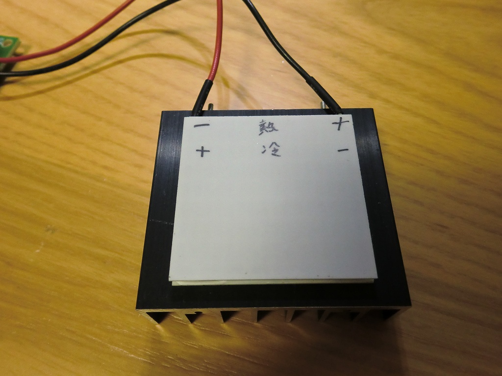 左下:ペルチェ素子。極性間違えないように記入。