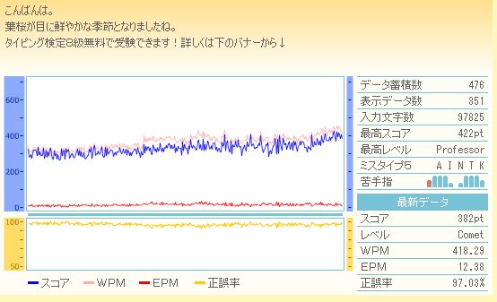 中学3年の頃から一気にタイピング速度早くなるということが無くなったが、それでも少しずつスコアが上昇している。